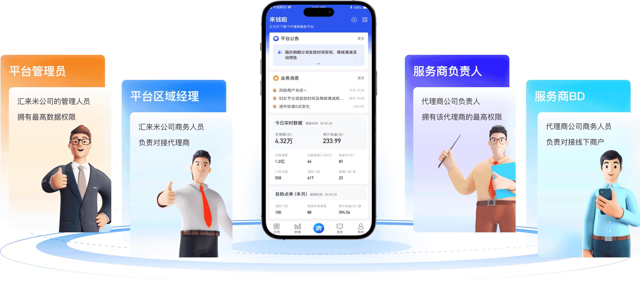 整合渠道商和商户两端功能,为渠道商提供商户、代理商、终端及团队管理能力,为商户提供门店经营、营收分析和商家服务,助力展业更便捷、数据更清晰